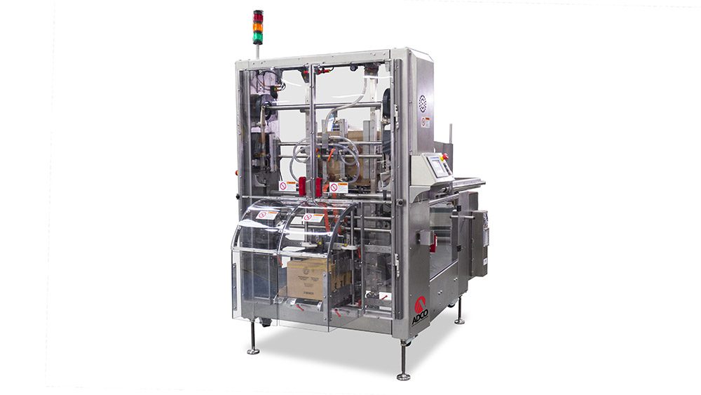 Featuring a 5’ powered magazine and available fast “no-tool” changeover, the compact and simple to operate CTF 470V is ideal for the most demanding production environments. The servo powered mandrel allows the stroke travel to be optimized by folding flaps gradually, maximizing compression, and accelerating the return stroke. Like all ADCO machines, the CTF 470V is constructed in stainless steel and is available in both standard and washdown configurations.